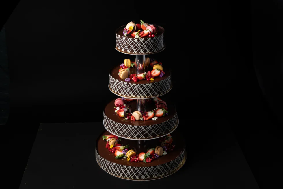 4 etasjes bryllupskake Callebaut-sjokolademoussekake
