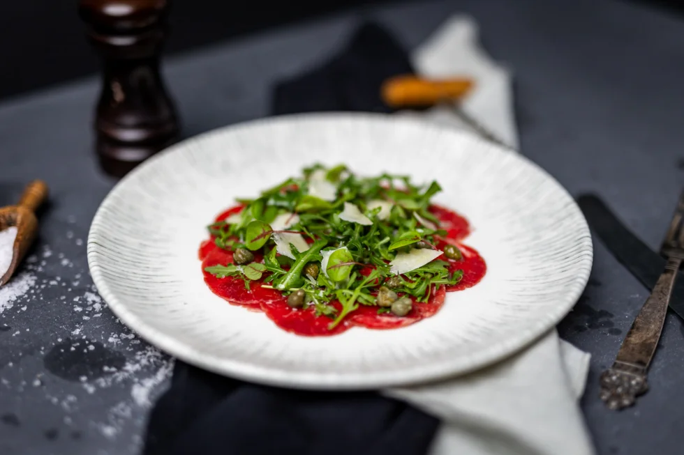 Carpaccio på okse indrefilet med ruccolasalat, høvlet parmesan og extra virgin olivenolje