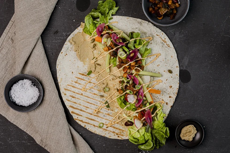 Stor tortillalefse fylt med med kikerter, grillede grønnsaker, ristede solsikkekjerner, syltet rødløk og hummus. Rulles sammen med friske grønnsaker og sprø salat.