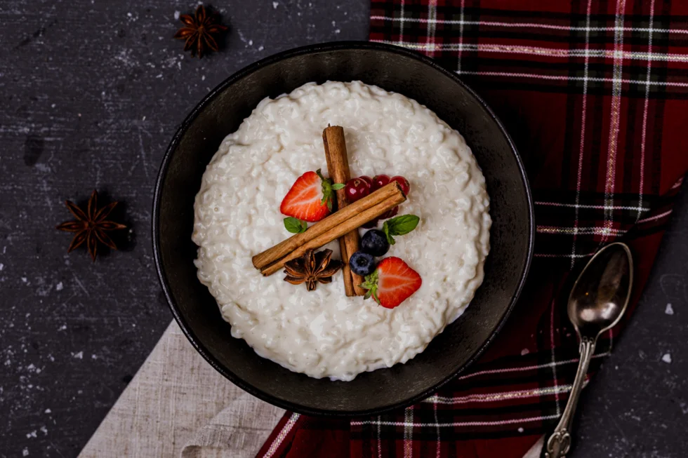 Vår julegrøt serveres med smør, sukker og kanel ved siden av. 400 gram per porsjon.
