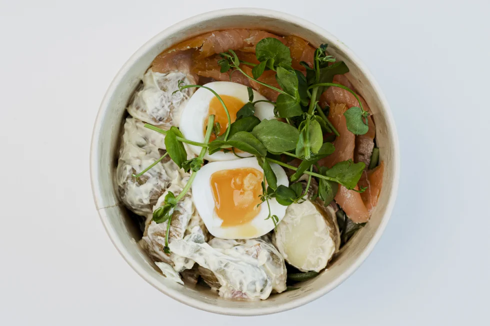 Flyt røkelaks, kokt egg, søtlig rettich/agurksalat med dill og røkt potetsalat.