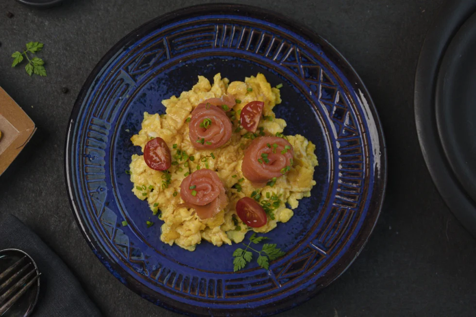 Flyt røkelaks anrettet med saftig eggerøre med gressløk.