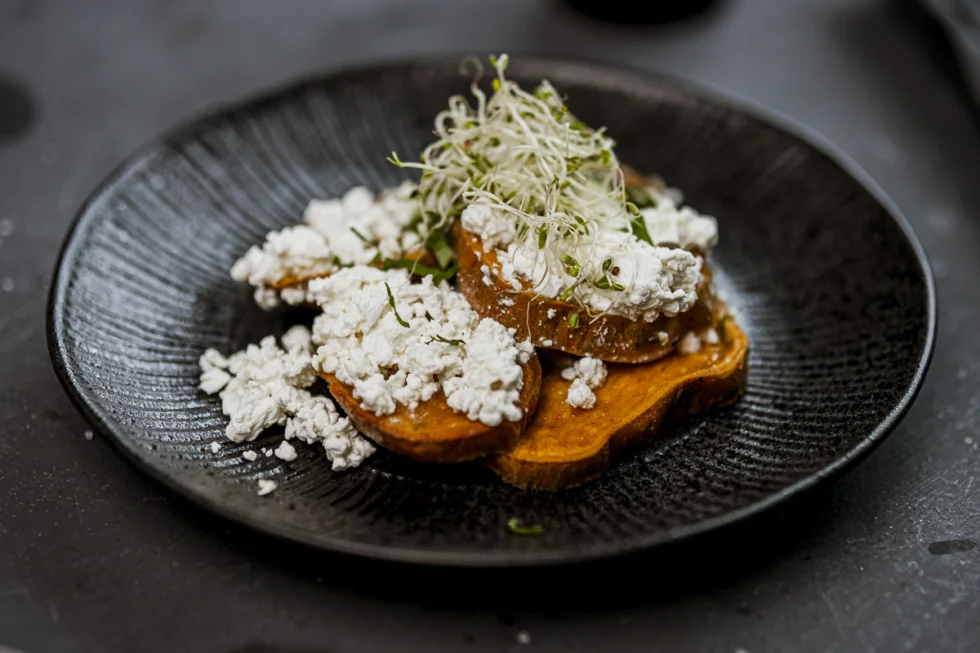 Honningbakt søtpotet og fetaost, ristede solsikkekjerner