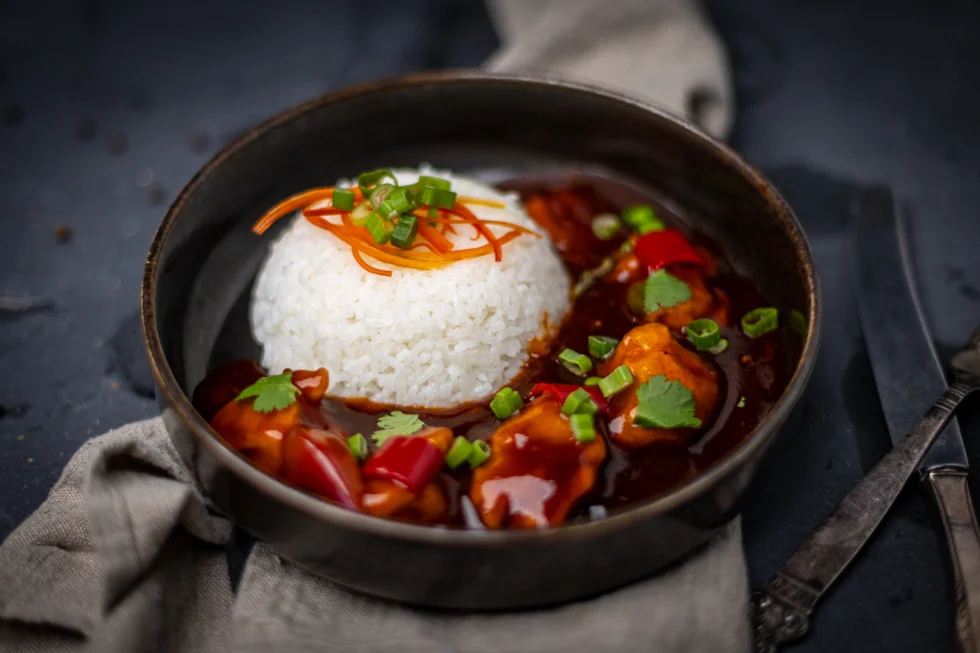 Velsmakende sweet and sour spicy koreansk kylling med pak choi og Oi-muchim agurksalat.