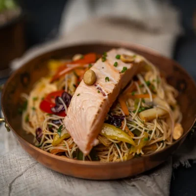 Frisk korander og peanøtter følger med – strøs over rett før maten serveres.
