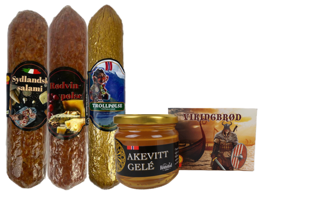 Spekepølse Spansk Chorizo 200g, Spekepølse Trollpølse 200g, Rødvinspølse 200g, Vikingbrød (flatbrød), Akevittgele fra Romstad Gård, pakket i gavepose